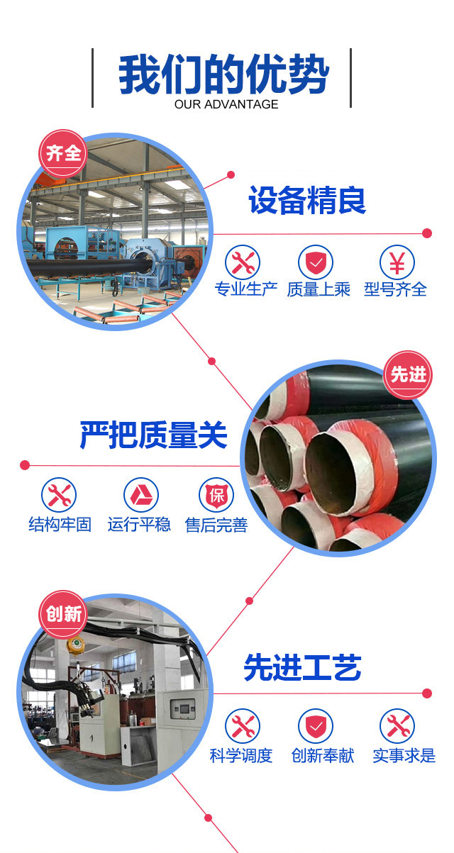 河北巨擎管道制造有限公司公司实力不断加大,先后购置了多台先进的生产设备:真空定径挤出机9台,采用先进的螺旋模具挤出、真空定径、喷淋冷却、自动切割等工艺,年生产 Ø90-Ø1980 聚乙烯外护管4万吨。拥有PU600、PU300、PU200 三种型号发泡机及相配套的穿管设备和发泡平台,年产DN50-DN1600 保温管道 15万公里,保温管件3万件;抛丸机2台、电晕设备4台、电热熔套袖生产设备3台。做到了自动化,模具化,现代化生产。
